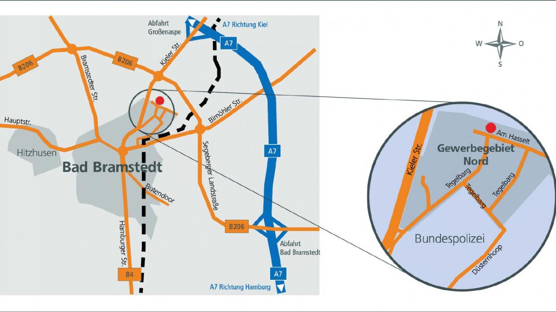 DENTAL DESIGN OHG liegt zwischen Flensburg und Hamburg, im Kurort Bad Bramstedt mitten im Gewerbegebiet Nord, ca. 6 Km von der BAB A7 entfernt. Neben der BAB A7, Ausfahrt Großenaspe / Bad Bramstedt Nord oder Bad Bramstedt/Segeberg, erreichen Sie uns über die Bundesstraße 4 (aus Richtung Hamburg bzw. Neumünster) oder die Bundesstraße 206 (aus Richtung Bad Segeberg bzw. Itzehoe).